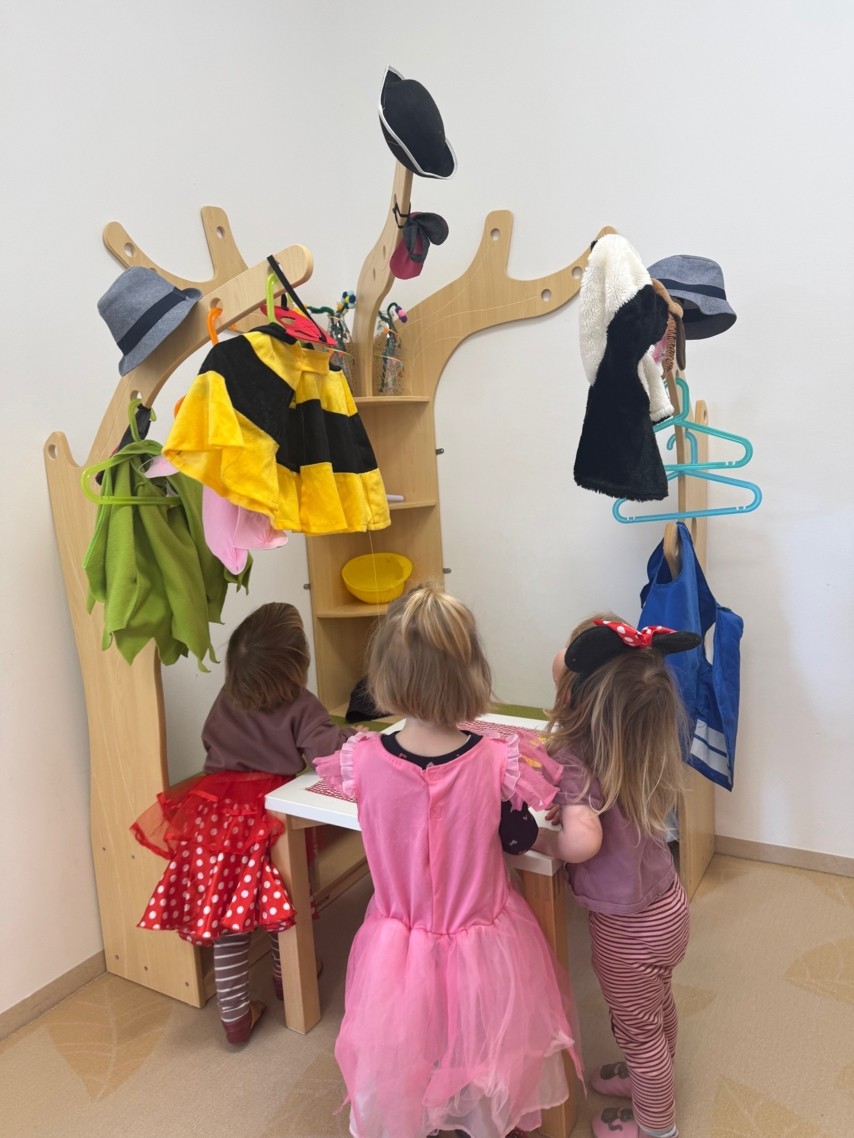 Die Verkleidungsecke fördert Fantasie und Kreativität, indem Kinder spielerisch in verschiedene Rollen schlüpfen. Dabei entwickeln sie Sprache, soziale Kompetenzen und Empathie, lernen miteinander zu kooperieren und Gefühle auszudrücken. Gleichzeitig werden Feinmotorik und Selbstständigkeit durch An- und Ausziehen gestärkt. Das Rollenspiel unterstützt zudem das Selbstbewusstsein und die Persönlichkeitsentwicklung der Kinder.